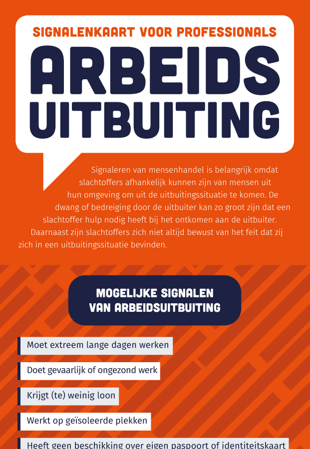 Er zijn verschillende vormen van mensenhandel, zoals seksuele uitbuiting, arbeidsuitbuiting of gedwongen criminaliteit. Het herkennen van de signalen van mensenhandel is ontzettend belangrijk. Soms kan het zich in je omgeving afspelen, zonder dat je het ziet. Een jongen die gedwongen wordt om te stelen en de buit moet afstaan is mensenhandel. Een vrouw die onder valse belofte in Nederland komt werken, en wordt opgesloten om dag en nacht te poetsen is mensenhandel. En een meisje dat door haar vriend wordt gedwongen om seks te hebben met zijn vrienden is ook mensenhandel.